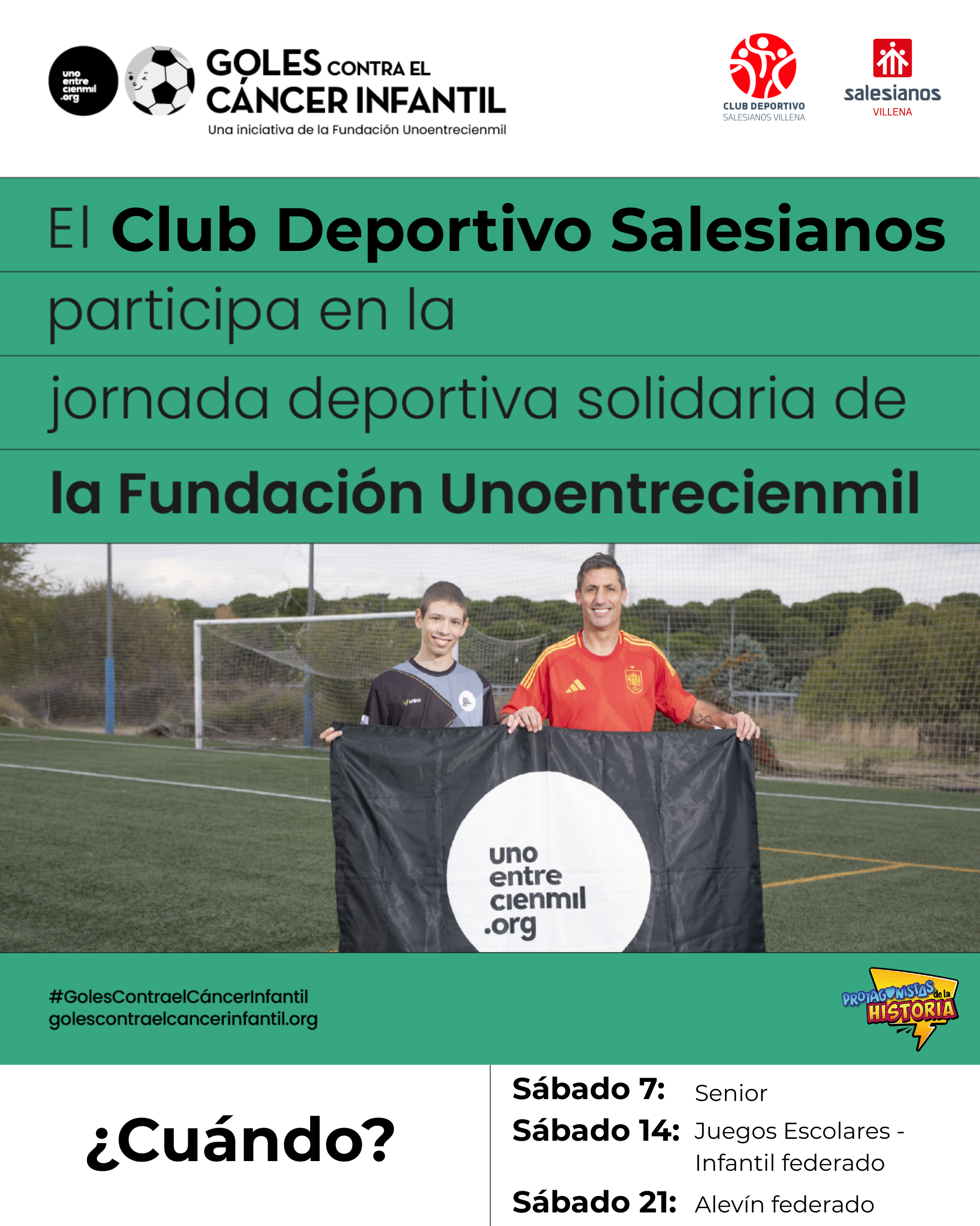 El Club Deportivo Salesianos Villena, a través de sus secciones de baloncesto y fútbol sala, se suma durante el mes de febrero a la iniciativa solidaria para impulsar la curación del cáncer infantil, colaborando con la Fundación Unoentrecienmil en las campañas Canastas Solidarias y Goles Solidarios.